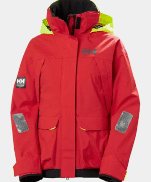 Shoulder Detail: Red Leather or Faux Leather accents around the neck/collar.