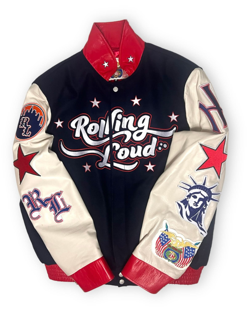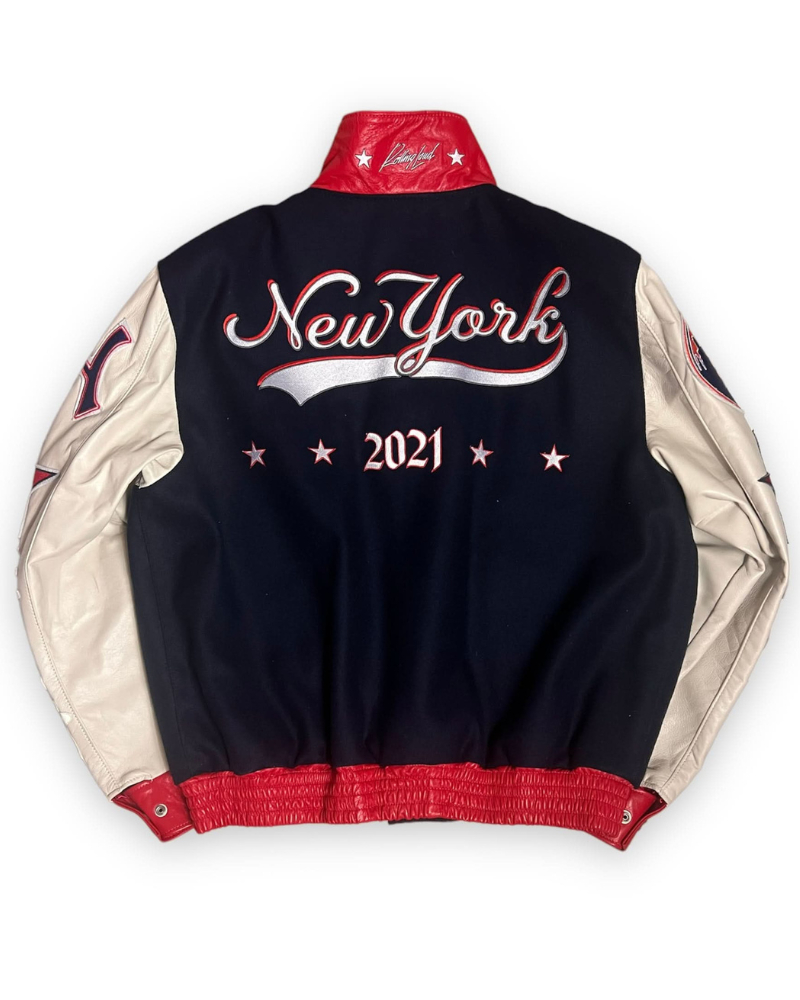 Color: Navy/Black body, Cream/White sleeves, Red accents.